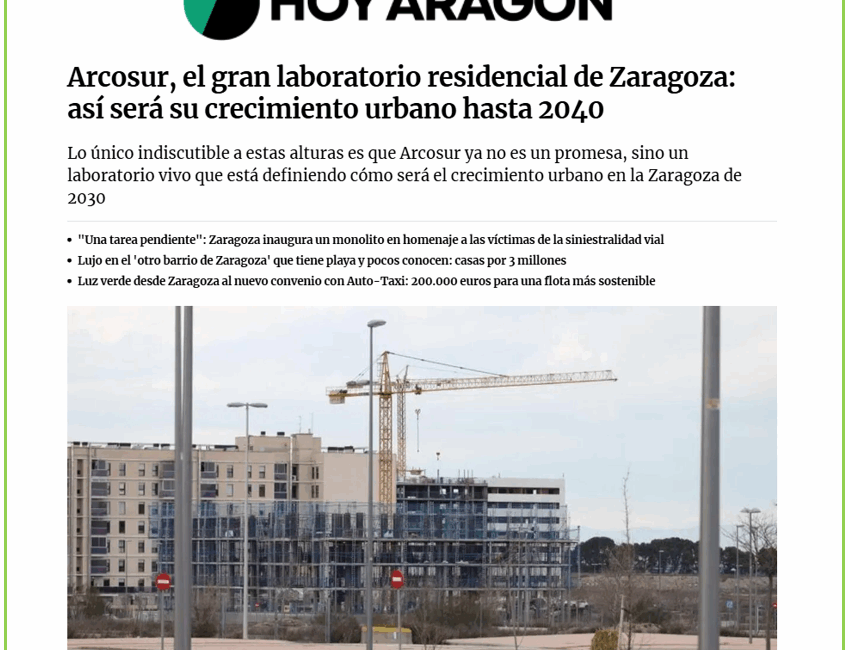 Según el artículo: «ARCOSUR ZARAGOZA se ha convertido en el gran laboratorio residencial de Zaragoza, el espacio donde se redefine —en tiempo real— cómo será el crecimiento urbano del siglo XXI. Lo que hace quince años era un proyecto lleno de incertidumbres es hoy el principal motor de vivienda nueva en Aragón, un barrio joven, en expansión y observado por urbanistas y promotoras como un experimento a gran escala»