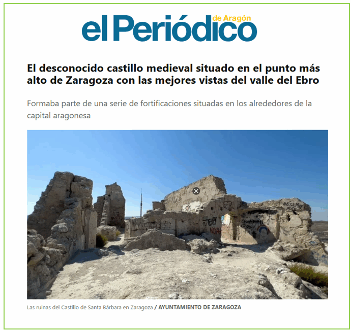 Curioso el artículo del Castillo de Santa Bárbara construido en un montículo estepario a 346 metros sobre el nivel del mar en las inmediaciones de Valdespartera y Arcosur. Sólo quedan ruinas pero desde el Castillo-Ermita se puede contemplar unas excelentes vistas de ARCOSUR ZARAGOZA.