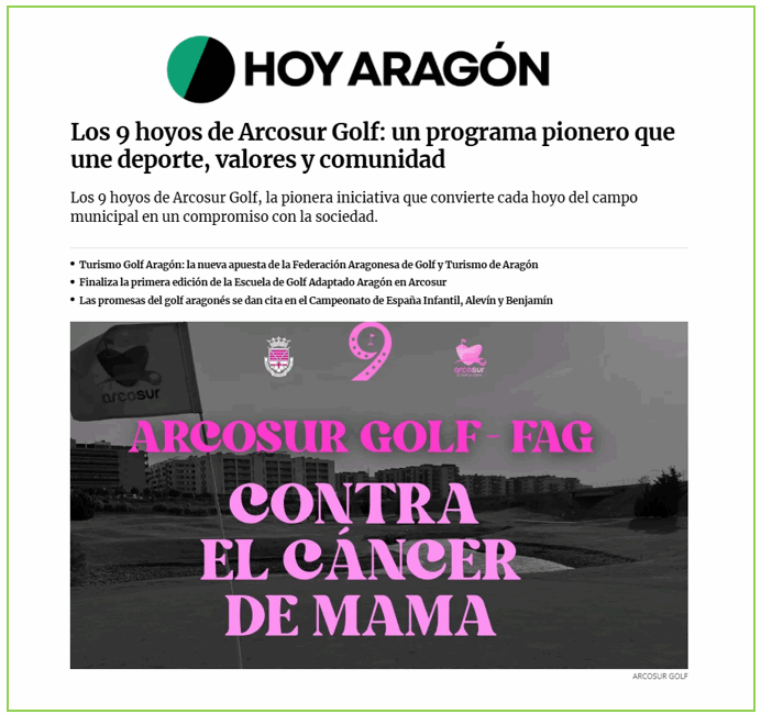 Arcosur Golf, con el impulso de la Federación Aragonesa de Golf, ha presentado el programa “Los 9 hoyos de Arcosur Golf”, una iniciativa que convierte cada hoyo del campo municipal en un compromiso con la sociedad.